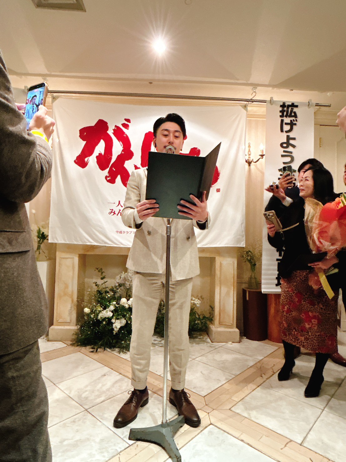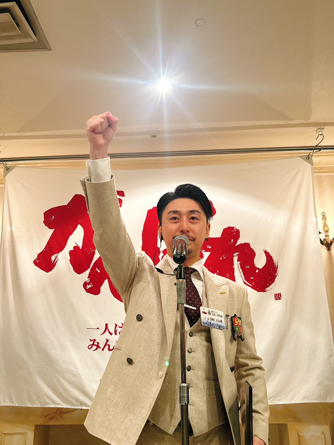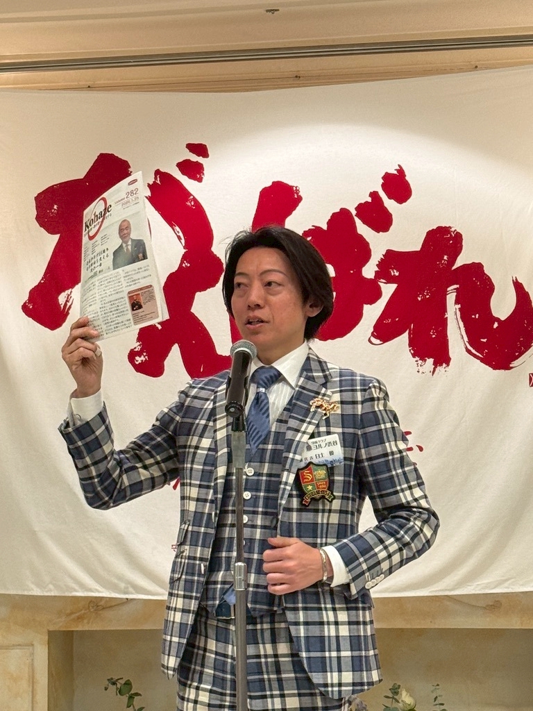 須藤将史代表の挨拶、来月3周年例会ということもあり、